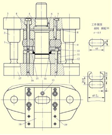 Figure 1 is a typical structure of a blanking die, which is a single process die with guide posts and guide sleeves. It consists of two parts, an upper mold and a lower mold. The upper mold consists of 5 mold handles, 3 upper mold seats, 2 guide sleeves, 10 blanking punches, 8 backing plates, 7 fixing plates, 14 unloading plates, screws and pins. The lower mold is composed of 17 lower mold seats, 1 guide post, 11 cutting edges, 15 guide plates, 18 material receiving plates, screws, pins and other parts. The upper die is mounted on the press slider through the die handle 5, and reciprocates up and down with the slider, so it is called the movable part. The lower mold is fixed on the worktable of the press by locking the lower mold seat, so it is also called the fixed part.
