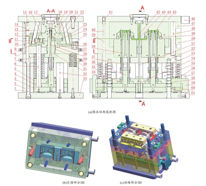 plastic parts plus runner product structure are adopted, the designed mold assembly structure and 3D effect are shown in Figure 1.