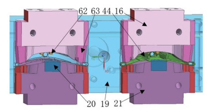 Figure 2 shows the structure of the cavity. The cavity structural components are mainly composed of side core A16, main cavities, clamping insert, side core B21, insert 62, and T-shaped insert 63. The back side of the inner shell plastic part is formed on the side core A16. The protruding snap-in insert is close to the main core to form the electronic board on the back of the plastic part. The splicing of the cavity structure can not only solve the problems of forming the plastic part structure and difficult processing of the mold, but also can use the splicing gap to strengthen the exhaust of the mold.